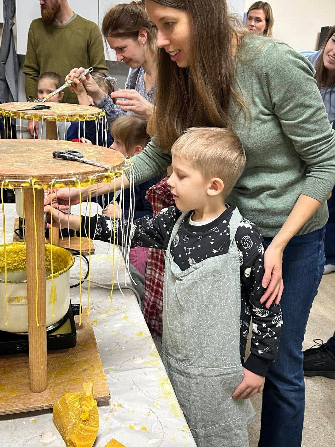 Adventiniu laikotarpiu lopšelyje-darželyje "Naminukas" vyksta grupių vakaronės kartu su tėveliais. Gruodžio 10-osios pavakarę ,,Pelėdžiukų“ grupės vaikai kartu su tėveliais aktyviai įsitraukė į bičių🐝vaško žvakių liejimo edukaciją. Užsiėmimo pradžioje visi dalyviai susipažino su natūraliu bičių 🐝vašku, jo kvapu, spalva. Vaikai smalsiai tyrinėjo vaško plokšteles, o tėvai padėjo atlikti pirmuosius veiksmus – kartu su jais samčiu pylė vašką ant siūlo.