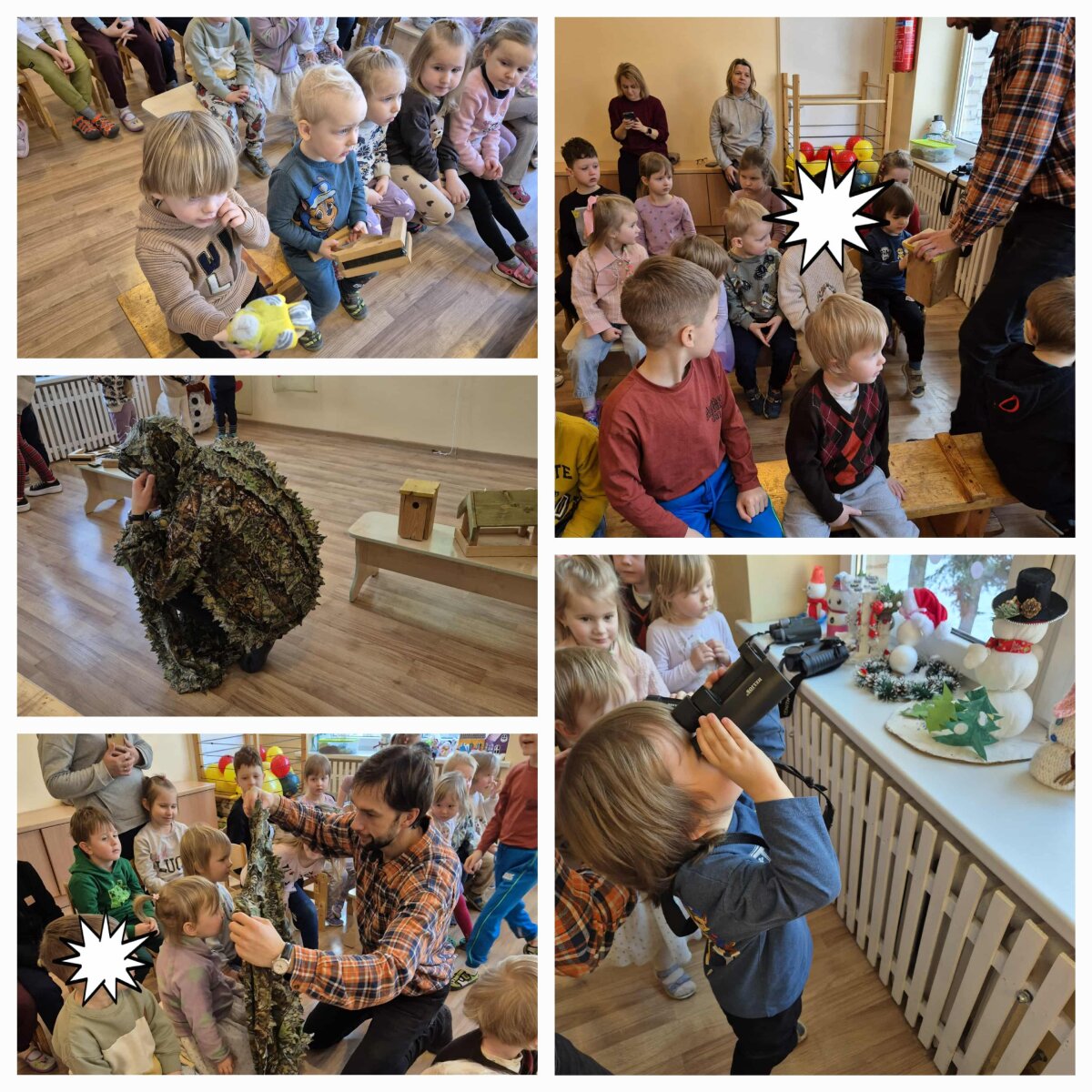 Vaikams buvo įdomu pamatyti, kokia maskuojančia apranga rengiasi ornitologas, kai fotografuoja paukščius miške - ji panaši į aplinkinę augaliją, medžių lapus. Atitinkamai žiemos metu, kai yra sniego, rengiasi balta apranga.