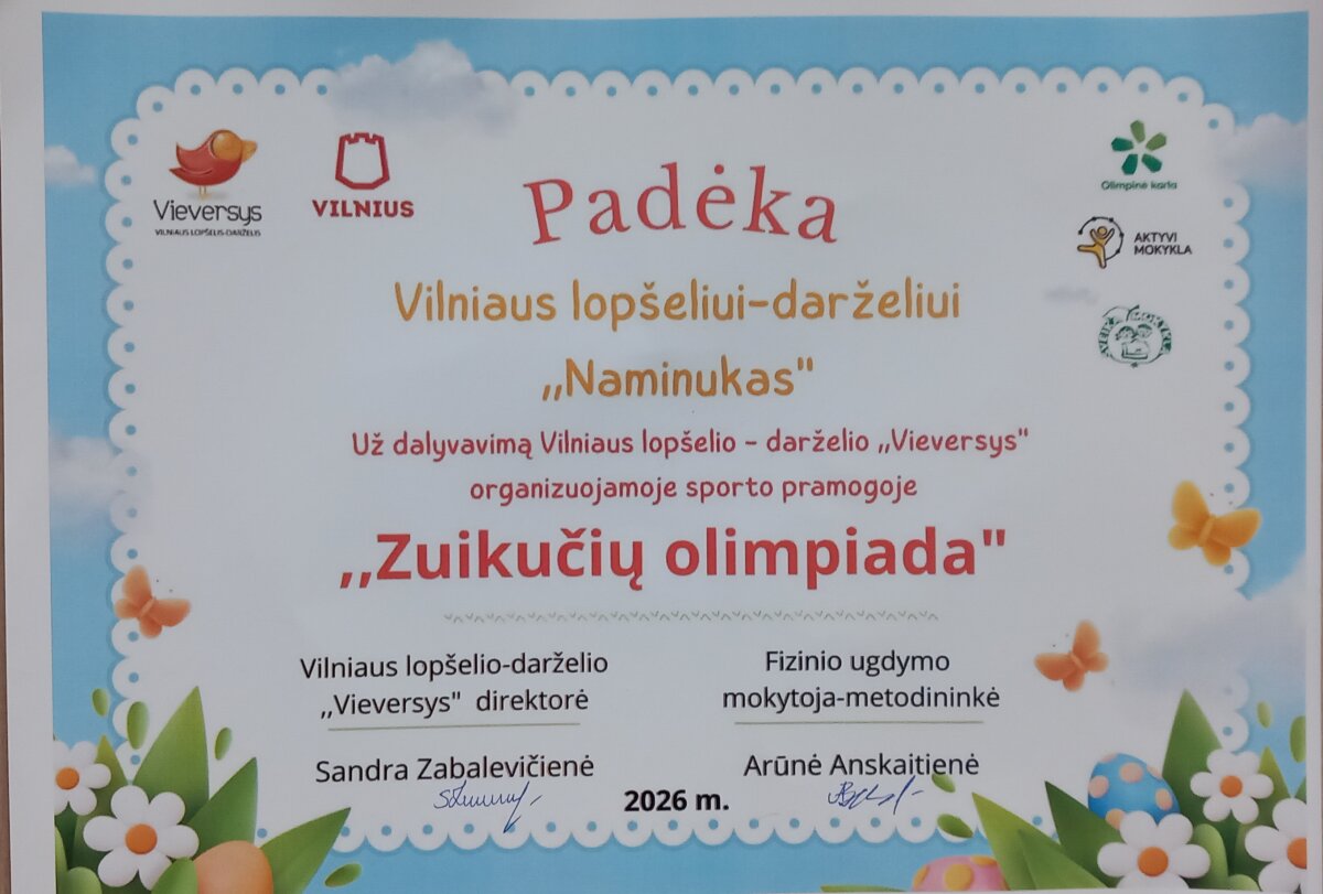Kovo 26 d. „Drugelių“ grupės vaikai dalyvavo Emilijos Pliaterytės progimnazijoje vykusioje sportinėje pramogoje „Zuikučių olimpiada“, kurią organizavo Vilniaus lopšelis-darželis "Vieversys". Vaikai smagiai sportavo: nešė ir rideno kiaušinius, šuoliavo, dalinosi morkomis bei dalyvavo linksmame balionų mūšyje.